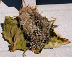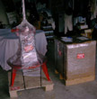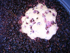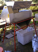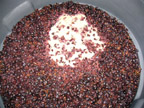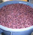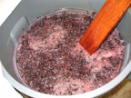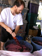 | Sept. 6, 2005 The Cap Rises I'm up at 5:30 am to check progress. T + 18 hours since the yeast was added. It was a cool evening, and I kept the screen door to the garage open. (We had the screen door put in this year to keep out the possums, raccoons and rats.) I'm not impressed with the progress of fermentation, so I gently stir the exposed yeast in with the must. By noon (T + 24H), the cap is rising, and I take the trusty Virginia Tech Paddle and carefully break the cap, as an icebreaker ship treads through frozen arctic seas, until the grape juice is exposed, generating a wake of frothy fuchsia foam. In the early afternoon, the cap has risen indeed and the fermentation is well underway. I'm liking the color of the mixture. A deep purple already. The paddle has turned deep magenta. I think of making tie-dye shirts. Our new press has arrived. I unpack it. It's impressive, and should be much easier than pressing by hand, which took two days last year! (More progress.) The wooden basket it comes with is not exactly light ... this could require some serious work. Before bed, I break up the cap again, with thoughts of this being a good wine. |