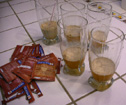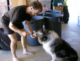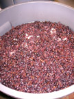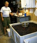 | September 7, 2005 Maintenance & A Scare I am greeted at 5:30 this morning with the "snap, crackle, pop" of fermenting grapes and an even higher cap that approaches the edges of the container. This could be good news -- more wine! Although I shouldn't start counting my magnums until the cork's put in, I know a facility with a still that will distill extra wine for me. What do you call distilled wine? Cognac! Bluey approves of the idea, so we'll give the distillery a call and start inquiring about making some brandy with the extra s ... also, I'm wondering what can we do next week with the leftover skins and seeds? Isn't that what Grappa's made from? Bluey enjoys helping me clean the paddle (with his tongue) after breaking the cap. I'll have to watch out for a drunken dog. He reminds me of a kid licking brownie batter from a spatula ... maybe this is where wine critics develop "hints of chocolate" when describing wine. To me, it tastes like semi-fermented grape juice. A vigorous fermentation is taking place. At the evening night cap, I notice the heat being generated. I wash my hands, then dip in a clean finger. Is the wine running a fever? The temperature seems to be approaching that of my body ... fermentation above 90 degrees could be an issue. I go inside, and consult Lum's article "Basic Winemaking" (7/23/05) which states: "Red wines are fermented at temperatures ranging from 75 to 92 degrees...." I remember him telling stories of dropping icepacks into fermenters to cool down the reaction taking place. There is a handwritten note on the article: 93 degrees is the killing point for yeast. Ah ohhhh ....this could be trouble. I go to the hot tub spa to grab a thermometer, but it's not there. I open up the garage door to let more cool air in ... after punching the cap down, I give it one more punch to allow heat to escape ... shoot, I should have bought a thermometer! I send Alan (who is studying the science of wine at the University of California, Davis) an e-mail ... he says 105 degrees is fatal for most yeast. I know we're not that high ... I'm a little uneasy, and go to bed. |