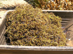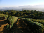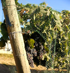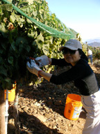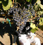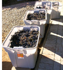 | Grape Harvest and Crush Sept. 4, 2005 If you ever taste a glass of wine with hints of espresso and chocolate please send me the bottle. If you ever here me ascribe such flavors to wine, then it’s time to cut me off. On the other hand, you may hear me talk of the essence of bird’s nest in fine wine. We found a nest today while gleaning Mike’s vineyard of Merlot grapes. I also rescued a ladybug from the must, which had somehow passed unharmed through the destemmer and crusher, the machine with a giant blade that removes stems from grapes and breaks their skins. “Please don’t test the clippers with your fingers to see if they’re sharp,” warns Mike, as he gives us instructions before releasing us into the vineyard. “Believe me, they’re sharp!” “If you cut off your finger,” advises the doctor on hand, pick it up and place it on ice immediately. If at all possible, pick it up before it goes through the crusher; it’s a whole lot easier to pick it out then.” Coastal fog blinds us in the morning, as we drive north on I-15 from San Diego towards Escondido. I turn on the car’s fog lights. The temperature is 57, and my sophomore instinct welcomes the cool temperature, which will make the morning's work more comfortable. The fog lifts as we enter Escondido. The morning is bright. It’s a magnificent day. “Thank goodness there’s no fog here,” says Nancy, as we look over the hillside and see traces of mist in distant valleys “Damp air causes mold on the grapes,” she explains. The grapes like sun, and she shows me an example of a vine in the shade they left untreated from mildew spray, with withered, deformed, useless fruit. Bluey patrols the vineyard for raccoons and birds. “Oh my, there’s an Australian Shepherd,” cries one of the pickers. “That’ s a plump Australian Shepherd,” says another. Bluey is well fed by him mom, and with me out of town the past week, he has run less, and put on extra pound or few. “From Zero To Naked In 1.2 Bottles of Wine” states the sign leading to the gazebo area at the property’s summit, where two dozen day amateur winemakers have gathered for a champagne toast. Many have brought a bottle of wine to share at the potluck picnic after the harvest. Most couples will take home a couple of hundred pounds or crushed grapes. We paid $500 for 1,000 lbs. We are joined by 4 professional vineyard hands, who speak Spanish and will eat their lunch separately. Mike and Linda’s place is a fine example of Blue-Merle Country living, and earns Bluey’s highest Four Paw ranking. They have designed it with practicality in mind. There is a restroom/toilet on the ground floor, accessible from the outside. Also on the ground floor (looking out over the vineyard and onto a vista of Palomar mountain) is a wine bar. In the catacombs behind the bar is their naturally cool “cave” for wine fermentation, storage and testing lab. “The first year we picked 5 pounds,” recalls Mike. “One of the pickers stopped to taste a grape, and I almost shouted at him, because that one grape represented a significant percentage of the harvest,” he jests. This year, he’s expecting to reap 17,000 lbs. “Some of the grapes are dried and look like raisins,” he instructs us. “Go ahead and cut those and throw them in the buckets – they will add a lot of sugar.” At the end of the picking, Mike, a generous host, invites me and others into his cellar and lab. He Mike runs another test measuring the sugar content. “Just under 26 brix.” That’s perfect. Acidity is also running at .67; so, there is no need to make any adjustment to the must. Mike tells me that Lum was here yesterday, and he also took 1,000 lbs. “Let’s have a contest to see who makes the better wine,” I joke. If Lum were here he’d probably say, “To make really good wine, you need really good grapes. You can’t make good wine unless you have good grapes. But you can make a bad wine from good grapes. I know. I’ve done it!” Mike offers me a taste of grape juice … it has hints of his 2004 vintage Merlot, which I sampled with lunch. Dreamy nectar. Driving down the hill, there is an abrupt dip … I notice it too late, and slam the brakes in an attempt to slow down. The containers smash into one another; the handles prying open the lids of several containers. A close call, but not a drop spilled. Finding a truck was a logistics challenge this year, again. One friend who wanted to loan us theirs experienced mechanical difficulties the week before, and had to cancel. Another friend offered me his, but it wasn’t available the whole day. This left me scrambling, while out of town during the week, to find a truck. I made arrangements with Enterprise to pick one up Downtown at 9:15 am. So, first it was to the vineyard to pick. Then Downtown (about 50 miles away) to pick up the truck. When I arrived the truck wasn’t available, and fortunately the representative located one at their Airport location, not far away. So it was back to the house to pick up 5 of the 32 gallon containers, and back to the vineyard, where the crushing had already been completed. I was not alone with car troubles. The truck of another fellow who joined us broke down that day… he ended up leaving his grapes with Mike in the cellar until he could get the truck fixed. Mike and I measured out 1,000 lbs. of must, which was divided unevenly into 14 containers weighing 37 – 96 lbs. He, and some of the other pickers, helped carry the containers up to the truck in the driveway, and Mike helped me empty each one into one of my 5 containers. As we proceed with the work, there’s a temptation to lift the containers by oneself to keep the momentum going. Not a good idea for most people, if they wish to keep the chiropractor away. Back at our house, I put a wooden board from our bed flush against the ledge of the pickup which we did last year. But the plank is unstable, and I’m concerned about slidin