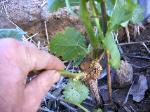 Taping vine to the pole, so it will grow straight, or at least more straight. At 5 or so minutes per vine (pull off the tube, pull out the "sucker" vines, put rocks around the vine, tie the vine up, put the tub back on) -- this is a long process with 850+ vines!
